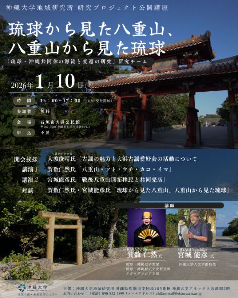 沖縄大学地域研究所 研究プロジェクト公開講座 「琉球・沖縄共同体の源流と変遷の研究」研究チーム 【日時】2026年1月10日(土) 【時間】14:00〜17:00(13:30受付開始) 【参加費】無料 【会場】石垣市大浜公民館 【申込】不要 【内容】 開会挨拶:大濱俊晴氏 講演1:賀数仁然氏「八重山・ツト・ウチ・カコ・イマ」 講演2:宮城能彦氏「戦後八重山開拓移民と共同売店」 対談:賀数仁然氏・宮城能彦氏