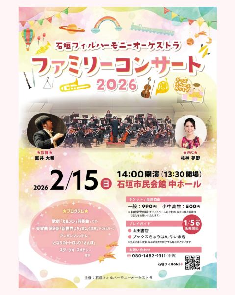 石垣フィルハーモニーオーケストラ ファミリーコンサート 2026 2026年2月15日(日) 13:30開場 / 14:00開演 【会場】石垣市民会館 中ホール 【チケット】全席自由:一般 990円/小中高生 500円 【プレイガイド】山田書店/ブックスきょうはん やいま店 【問い合わせ】080-1482-9311(中西)