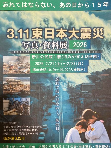 東日本大震災の記録写真と資料展示 期間 2026年2月21日(土)〜23日(月) 時間 10:00〜14:00 会場 新川公民館1階(旧みやまえ幼稚園) 入場無料