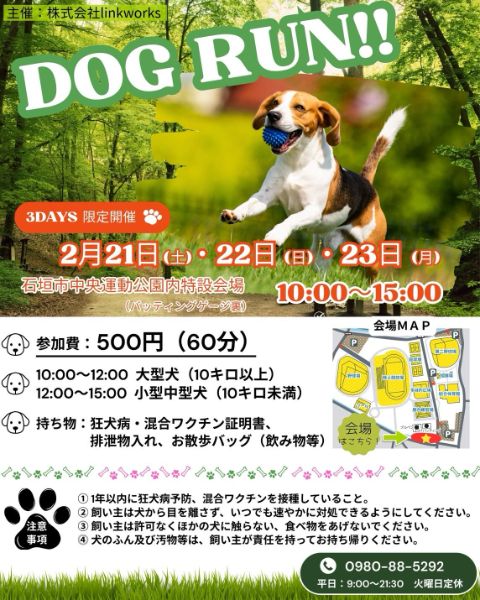 中央運動公園でのドッグラン開催。 日時 2026-02-21 (土)22(日)23(月) 10:00〜12:00 大型犬(10kg以上) 12:00〜15:00 小型犬(10kg未満) 場所 中央運動公園(詳細は主催SNS等をご確認ください) 参加に必要なもの ・狂犬病/混合ワクチンの証明書 ・排泄物入れ ・お散歩バッグ(飲み物など) 問い合わせ DMにて質問受付(詳細は主催SNS等をご確認ください)