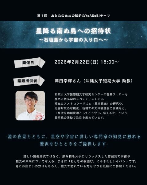 石垣島の夜をより深く楽しむためのサイエンスカフェ。 テーマ:星降る南ぬ島への招待状~石垣島から宇宙の入り口へ~ 話題提供者:澤田幸輝(沖縄女子短期大学 助教) 会場:石垣島ホテルイーストチャイナシー 3Fレストラン(石垣港を一望できるロケーション) 費用:無料 定員:20名程度(先着順。申込み多数の場合は参加をお断りする場合あり) 対象:星空や観光に興味のある方(小中学生は大人同伴。高校生以上推奨) 申込み:主催の案内(公式サイト「お問い合わせ」等)より。