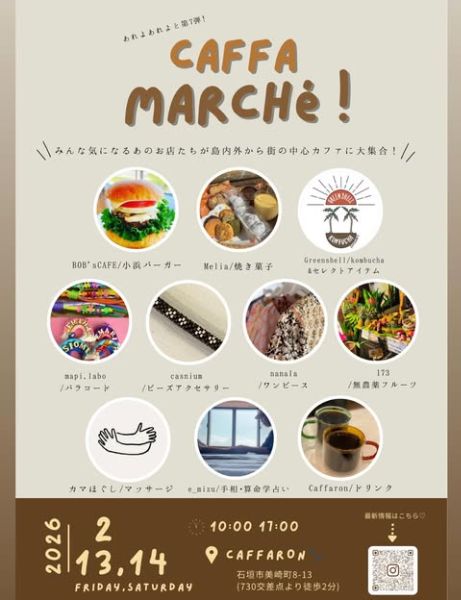 石垣島CAFFAで開催される人気マルシェ第7弾。 島内外のショップやフード、ワークショップ、占い、リラクゼーションなどが集まる2日間。 開催日:2026年2月13日(金)・14日(土) 会場:CAFFA 小浜バーガー、コンブチャ、アパレル、無農薬フルーツ、ヘッドマッサージ、手相占い、パラコードWSなど盛りだくさん。 街に来たついでにふらっと立ち寄れる、ゆるく楽しいマーケットです。