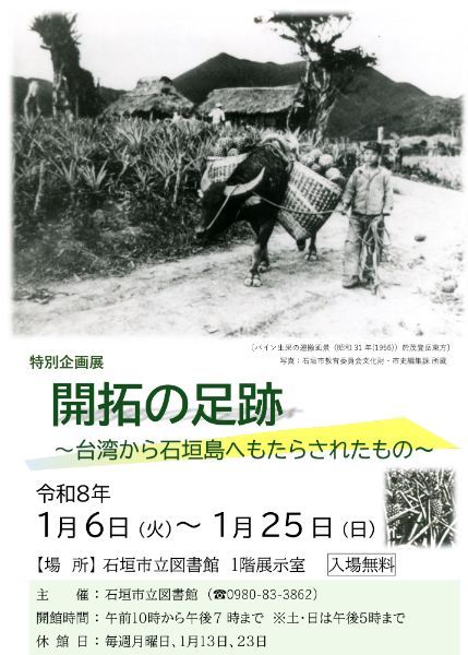 台湾から石垣島へ入植した台湾系移民に関する資料を中心に、昭和初期(1930年代)から平成27年(2015年)までの八重山開拓移民の歴史を辿る特別企画展。 【会期】2026年1月6日(火)~1月25日(日)※2月8日(日)まで期間延長 【会場】石垣市立図書館 1階 展示室 【対象】一般(入場無料) 展示内容: ・台湾からの入植史、開拓史、公民館記念誌資料 ・台湾からもたらされた文化・産業(パイン産業史など) ・写真資料、地図、記念碑写真の展示 ・台湾に渡った個人の回顧録 ・移民関連新聞記事・貴重資料の展示