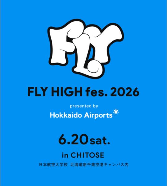 千歳市空港開港100年記念として開催される音楽フェス 「FLY HIGH fes. 2026」 ■日時 2026年6月20日(土) 開場 10:00 開演 12:00 ■会場 日本航空大学校 北海道校 新千歳空港キャンパス内(北海道) ■料金 一般 9,000円 学割 3,500円(高校生・大学生・専門学生/24歳以下) 子ども(中学生以下)無料 ■内容 千歳市空港開港100年を記念して開催される音楽フェス。 出演:きいやま商店、ほか ■関連リンク FLY HIGH fes. 公式サイト https://flyhigh-fes.jp/