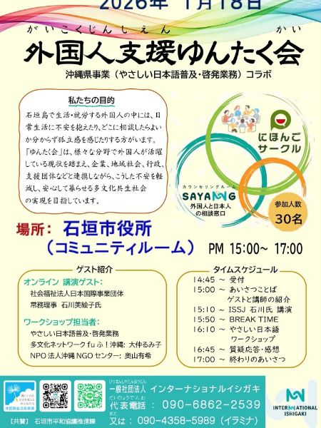 【第2回外国人支援ゆんたく会のお誘い】 石垣市の様々な分野で就労している外国人労働者が抱える「心の不安や悩み」を地域や企業等が理解し、どう支えていくか、支援のヒントやつながり方を共有することを目的に開催します。 オンラインでのゲスト講話やワークショップなどを通して、一緒に考えてみませんか。 申込不要。 日時:令和8年1月18日(日)15:00 場所:石垣市役所1階コミュニティルーム 問合せ:(一社)インターナショナルイシガキ 090-6862-2539