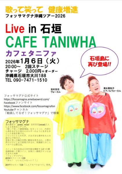 清水貴和子(ピアノ&ヴォーカル)と吉村京花(ヴォーカル)によるユニット「フォッサマグナ」の沖縄ツアー2026。 日程:2026年1月6日(火) 会場:CAFE TANIWHA(石垣市大川188) Live 20:00〜(2ステージ) チャージ:2,000円+オーダー カフェタニファならではのあたたかな空間で、フォッサマグナのハーモニーを楽しめます。