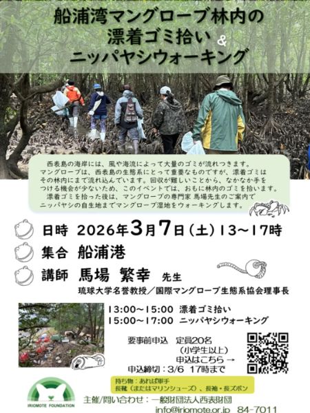 西表島・船浦湾のマングローブ林内で漂着ゴミを回収し、 その後ニッパヤシ自生地まで専門家と歩く環境保全体験イベント。 【日時】2026/3/7(土)13:00〜17:00 【集合】船浦港 【定員】20名(小学生以上/要申込) 講師:馬場繁幸先生(琉球大学名誉教授/国際マングローブ生態系協会理事長) 申込フォーム:https://docs.google.com/forms/d/e/1FAIpQLSfCszzCFv4Zcpv9UagjkgO5jW7LjXwgOZl4TtJ3l0YibrLMiQ/viewform