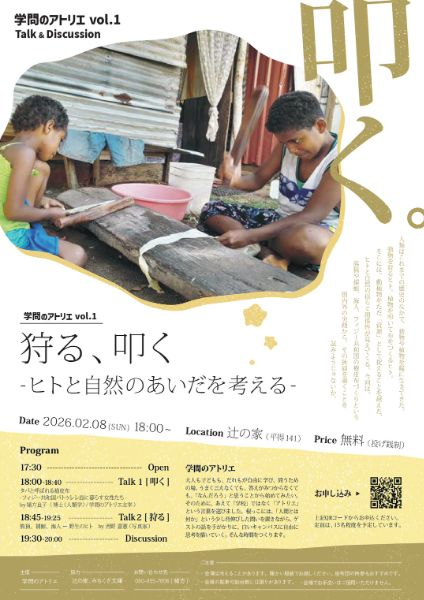 学問のアトリエ vol.1「狩る、叩く ―ヒトと自然のあいだを考える―」のトーク2 Talk 2「狩る」 テーマ:熊猟、捕鯨、海人―野生のヒト 登壇:西野嘉憲(写真家) 当日の全体プログラム:17:30 Open / 18:00-18:40 Talk1「叩く」 / 18:45-19:25 Talk2「狩る」 / 19:30-20:00 Discussion 会場:辻の家(平得141) 参加費:無料(投げ銭制) 定員:15名程度(申込はチラシ掲載のQRコードより) 協力:辻の家、みちくさ文庫 注意:会場は冷えることがあります。暖かい服装でお越しください。座布団の持参もおすすめです。会場の駐車可能台数には限りがあります。会場でお手洗いはご使用いただけません。