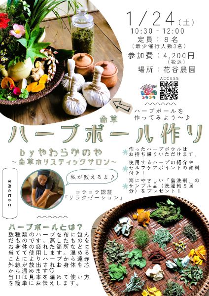定員8名(最少催行3名)。参加費4,200円(税込) 場所:花谷農園。作ったハーブボールは持ち帰り ハーブ紹介・セルフケア資料付き