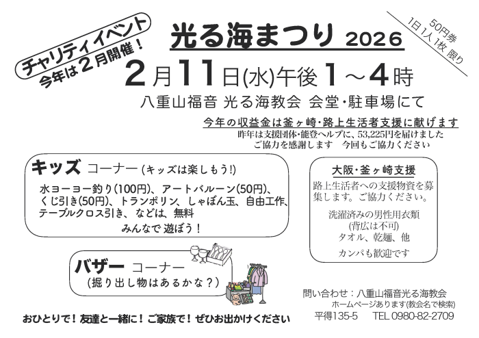 今年も「光る海まつり2026」を開催します。 キッズコーナーでは、水ヨーヨー釣り(100円)、アートバルーン(50円)、くじ引き(50円)、トランポリン、シャボン玉、自由工作、テーブルクロス引きなど、子どもたちが楽しめる催しを多数用意しています。 バザーコーナーでは、収益金を大阪・釜ヶ崎の生活者支援に捧げます。 駐車スペースもあり、おひとりでも、ご友人と一緒でも、ご家族でも楽しめる地域のお祭りです。ぜひお気軽にお越しください。