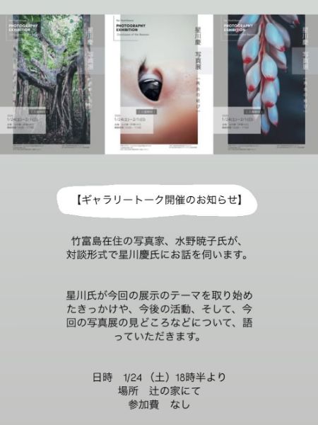 【ギャラリートーク開催のお知らせ】 竹富島在住の写真家、水野暁子氏が、対談形式で星川慶氏にお話を伺います。 星川氏が今回の展示のテーマを取り始めたきっかけや、今後の活動、そして、今回の写真展の見どころなどについて、語っていただきます。