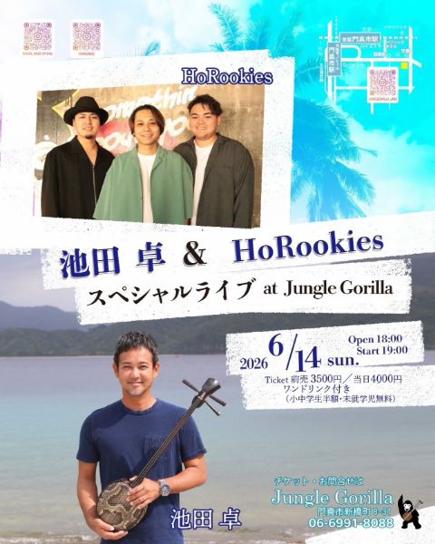 池田卓 & HoRookies スペシャルライブが大阪 Jungle Gorilla で開催。 沖縄音楽シーンで活躍する池田卓とHoRookiesによる2マンライブ公演です。 関西・門真市 Jungle Gorilla にて行われる 沖縄系ライブイベント。 ■日時 2026年6月14日(日) OPEN 18:00 START 19:00 ■会場 Jungle Gorilla 大阪府門真市新橋町8-31 ■料金 前売 3,500円 当日 4,000円 ※1ドリンク付き