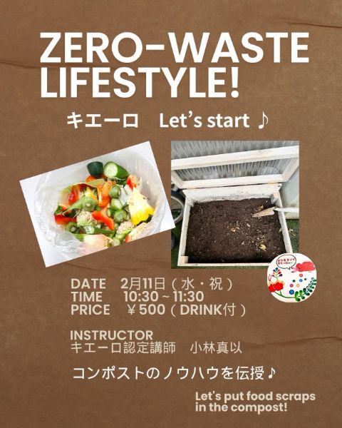 ZERO-WASTE LIFESTYLE! キエーロ Let’s start♪ コンポストのノウハウを伝授。 講師:キエーロ認定講師 小林真以 料金:500円(DRINK付)