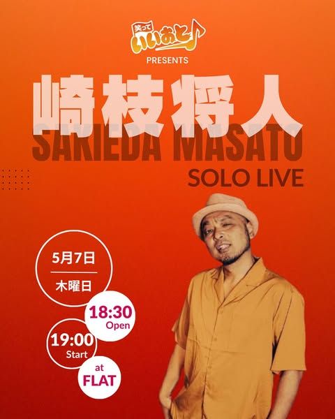 崎枝将人ソロライブ 笑っていいおと♪Presents 八重山出身シンガー崎枝将人によるソロライブ。 ■日時 OPEN 18:30 START 19:00 ■会場 清荒神 F♭LAT(兵庫) ■料金 3,500円+1ドリンク アコースティックスタイルのソロ公演。