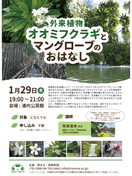 西表島の外来植物「オオミフクラギ」と在来種ミフクラギについてのお話。 現在行われているオオミフクラギ駆除の背景や、在来種への影響について解説します。 あわせて、講師・馬場繁幸先生によるマングローブのお話、海外でのマングローブ植林についての講演も行います。 日時:2026年1月29日(木)19:00〜21:00 会場:浦内公民館 講師:馬場繁幸 先生 対象:どなたでも 申込:不要