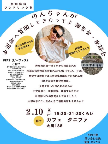 昨年大浜第一地下水から検出されたPFAS(PFOA・PFOS)について、水道部へ24の質問を行った報告会と座談会。 子育て真っ只中のお母さんが感じた不安をきっかけに、現状把握と理解を深めるための情報共有の場です。 【日時】 2026年2月10日(火)19:30〜21:30頃 【場所】 カフェ タニファ 石垣市大川188 【参加費】 無料(ワンドリンク制) 【内容】 ・PFASとは何か ・石垣の水の現状 ・水道部への24の質問共有 ・参加者座談会 大切な水のことを、みんなで共有しませんか。