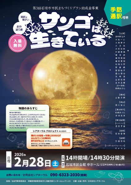 第3回石垣市市民まちづくりプラン助成金事業として上演される創作語り劇。 障がいの有無や年齢を越えて、多様な出演者がそれぞれの表現で一つの舞台を創り上げます。 シャボン玉が舞い、音楽が響く幻想的な“海の世界”を舞台に、サンゴと命をテーマにした物語をお届けします。手話通訳付きで、どなたでも楽しめる公演です。 【日時】2026年2月28日(土) 開場 14:00 / 開演 14:30 【会場】石垣市民会館 中ホール 【料金】入場無料 【主催】合同会社シアターウル 出演者・スタッフ一同、皆さまのご来場を心よりお待ちしております。