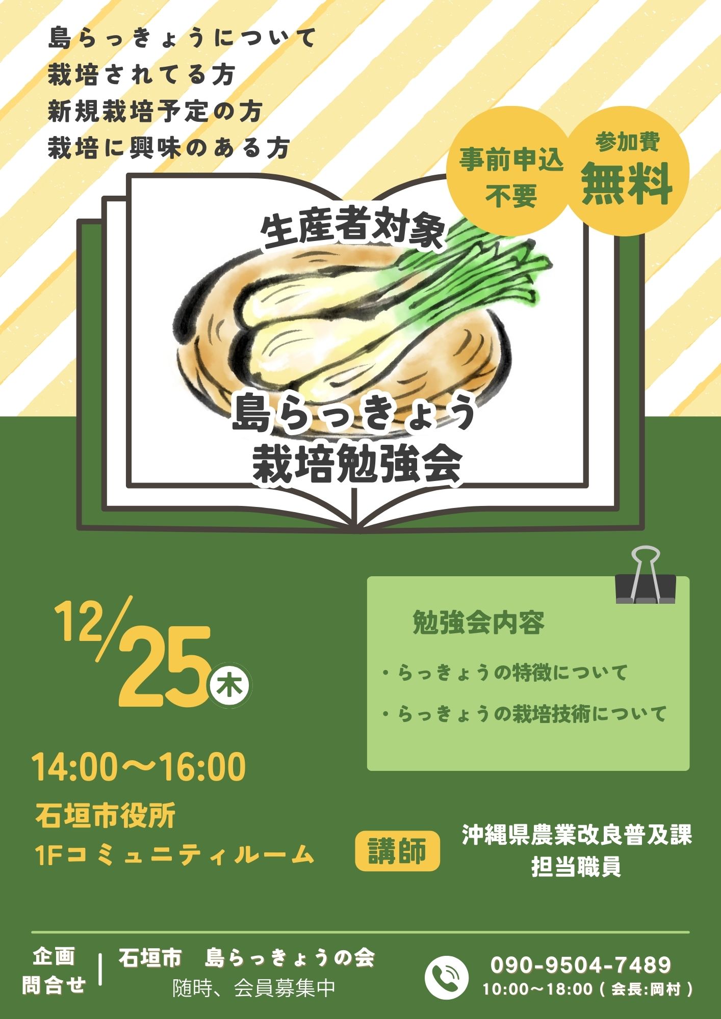 島らっきょうについて ・栽培されてる方 ・新規栽培予定の方 ・栽培に興味のある方 【内容】 ・らっきょうの特徴について ・らっきょうの栽培技術について 事前申込不要/参加費無料 講師:沖縄県農業改良普及課 担当職員