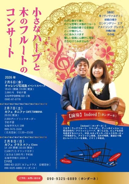 小さなハープと木のフルートのコンサート。 演奏:Indeed!(ホンダーネ) 日時:2026年2月6日(金)18:45開場/19:00開演 料金:2,000円(予約不要) 会場:チャレンジ石垣島 イベントスペース 住所:石垣市字登野城510 1階 お問い合わせ:0980-87-0778
