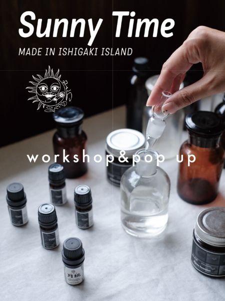 【SunnyTime】 自然と、島とつながる香り。“その土地で採れるもの”から生みだす。 石垣島の素材を活かしたスキンケアと香りのブランド。 【ワークショップ内容】 ・aroma room spray(240ml) ・aroma soy candle(60g) 自分の“今”の香りを選び、調合していくワークショップ。 お子さまも一緒に参加可能。 2つ目以降は200円割引。 ※予約制ではありませんが、予約があれば数を確実に準備します。