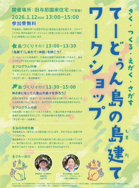 開催場所:旧与那国家住宅(竹富島) 日時:2026年1月12日(月)13:00〜15:00 参加費:無料 島づくりその①(13:00〜13:30) 「島建て(しまだて)神話」を聞こう!(ナビゲーター:中川奈津子) 島づくりその②(13:30〜15:00) 神さまになって八重山の島々を作ろう!(ナビゲーター:山本史) 協力:一般財団法人 竹富島地域自然資源財団