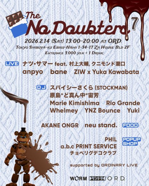 石垣島↔︎東京を繋ぐパーティー The No Doubters vol.7 東京編(Valentine Day Edition) LIVE & DJ、FOODブース、POPUP SHOP、ワークショップなど五感で楽しめるイベント。 デイタイム開催のため、お子さま連れも歓迎。 ※中学生以下入場無料 【日時】2026年2月14日(土)13:00〜20:00 【会場】代官山 ORD. 【Entrance】3,000円+1ドリンク(中学生以下無料) 【LIVE】 ナツ・サマー feat. 村上大輔 / クニモンド瀧口 / anpyo / bane / ZIW x Yuka Kawabata 【DJ】 スパイシーさくら / 原島“ど真ん中”宙芳 / Marie Kimishima / Rio Grande / Whelmey / YNZ Bounce / Yuki 【FOOD】 neu stand. / AKANE ONGR 【POPUP SHOP】 PHIL(おもちゃ屋さん) / a.b.c PRINT SERVICE / チョベリグデコクラブ supported by ORDINARY LIVE