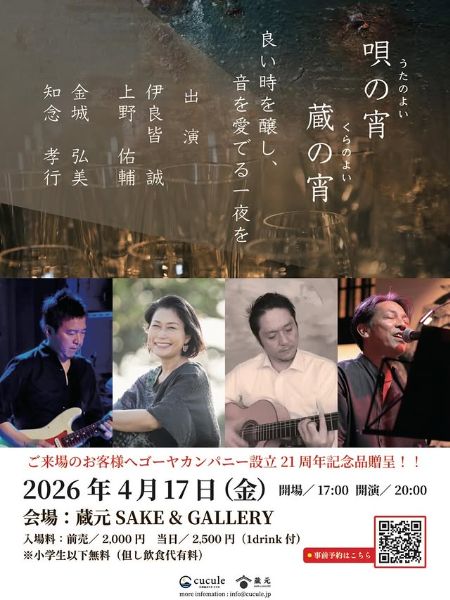 音楽とお酒を楽しむライブイベント「唄の宵 蔵の宵」 ■日時 2026年4月17日(金) 開場 17:00 / 開演 20:00 ■会場 蔵元 SAKE & GALLERY ■料金 前売 2,000円 / 当日 2,500円(1ドリンク付) ※小学生以下無料(飲食代別) ■内容 ゴーヤカンパニー設立21周年を記念した特別イベント。 ライブ演奏とともに、お酒と空間を楽しむ一夜。 出演アーティストによる多彩な音楽と、蔵元ならではの雰囲気の中で、ゆったりとした時間を過ごせます。 ■出演 伊良皆誠 上野佑輔 金城弘美 知念孝行 ■備考 事前予約推奨。