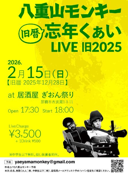 【八重山モンキー 旧暦忘年くぁいLIVE 旧2025@ぎおん祭り】 日程:2026年2月15日(日)※旧暦2025年12月28日 時間:開場 17:30/開演 18:00 場所:ぎおん祭り(沖縄県那覇市古波蔵1-1-11) 料金:前売 3,500円(税込)※当日1ドリンク 500円 ※中学生以下無料(保護者同伴) ※飲食代別途 予約・問合せ:yaeyamamonkey@gmail.com(件名:2/15八重山モンキー予約/本文:氏名、枚数(大人○枚・中学生以下○枚)、返信用メールアドレス)