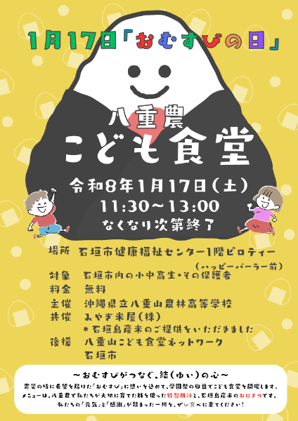 令和8年1月17日の「おむすびの日」に合わせ、八重山農林高校の生徒が主体となり、学園祭の収益を地域社会へ還元する形で開催される子ども食堂が開催されます。学園祭での収益を地域に還元し、食を通じて「助け合い(共助)」の精神を実践するため、高校生が主体となって企画しました。是非ご参加ください。 共催:みやぎ米屋株式会社 後援:八重山こども食堂ネットワーク、石垣市 ※11:30~12:30(なくなり次第終了)