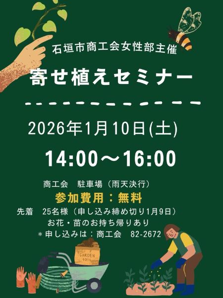 石垣市商工会女性部主催。 寄せ植えセミナー。 日時:2026年1月10日(土)14:00〜16:00 会場:商工会 駐車場(雨天決行) 参加費:無料 定員:先着25名(申込締切 1月9日) お花・苗のお持ち帰りあり 申込み:石垣市商工会 82-2672