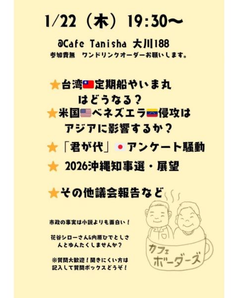 市政の事実は小説よりも面白い! 【内容】 ・台湾定期船やいま丸はどうなる? ・米国ベネズエラ侵攻はアジアに影響するか? ・「君が代」アンケート騒動 ・2026沖縄知事選・展望 ・その他議会報告など ※質問大歓迎!聞きにくい方は記入して質問ボックスへどうぞ! 【日時】2026年1月22日(木) 19:30〜 【会場】カフェタニファ(大川188) 【参加】参加費無料/ワンオーダー制(※高校生まで無料)